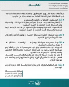 ضمن مسار العدالة وحماية الملكيات الخاصة، أعلنت محافظة حماة عن فتح باب استقبال طلبات المواطنين المتضررين من انتهاكات النظام البائد المتعلقة بالعقارات والممتلكات المصادرة أو المتعدى عليها.