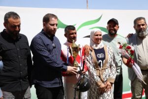 وأوضح رئيس نادي الفروسية بحماة زاهر جلاغي أن السباق شهد مشاركة واسعة من مختلف المحافظات وكانت المنافسة قوية ومثيرة على احتلال المراكز الأولى سيما وأنه تم تنظيم عشرة أشواط للمرة الأولى منذ فترة طويلة ، مبيناً أنه تم في نهاية السباق تكريم الفائزين الثلاثة الأوائل في كل شوط وسط حضور جماهيري واسع مهتم برياضة الآباء والأجداد.