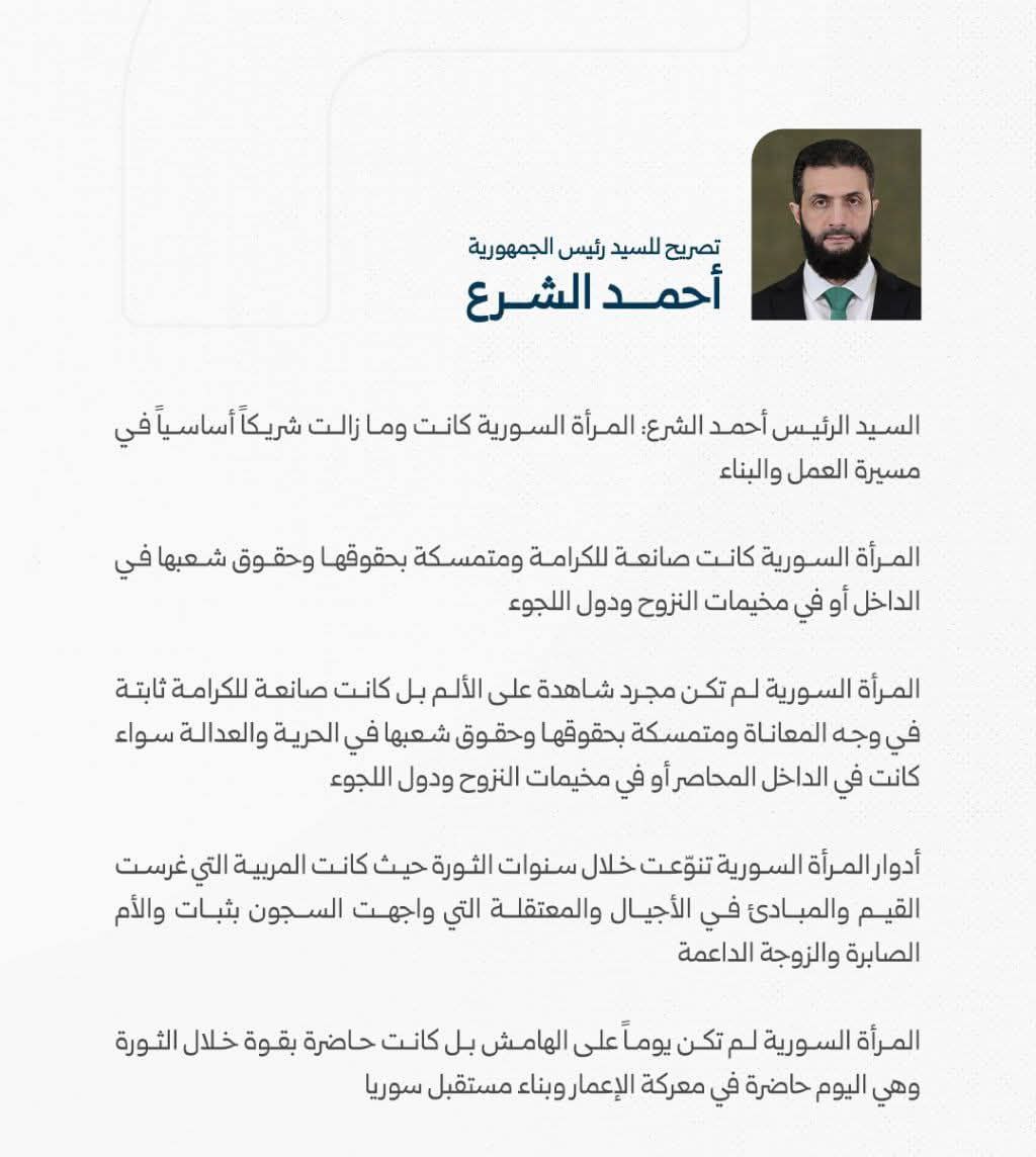 الرئيس الشرع: المرأة السورية عنصر محوري وشريك أساسي في مسيرة العمل والبناء