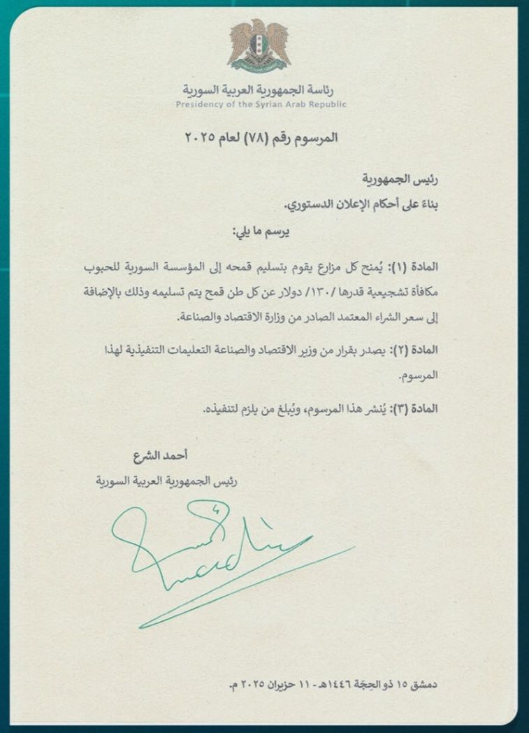 السيد الرئيس أحمد الشرع يصدر المرسوم رقم (78) لعام 2025 القاضي بمنح كل مزارع يقوم بتسليم قمحه إلى المؤسسة السورية للحبوب مكافأة تشجيعية قدرها 130 دولاراً عن كل طن قمح يتم تسليمه بالإضافة إلى سعر الشراء المعتمد الصادر من وزارة الاقتصاد والصناعة