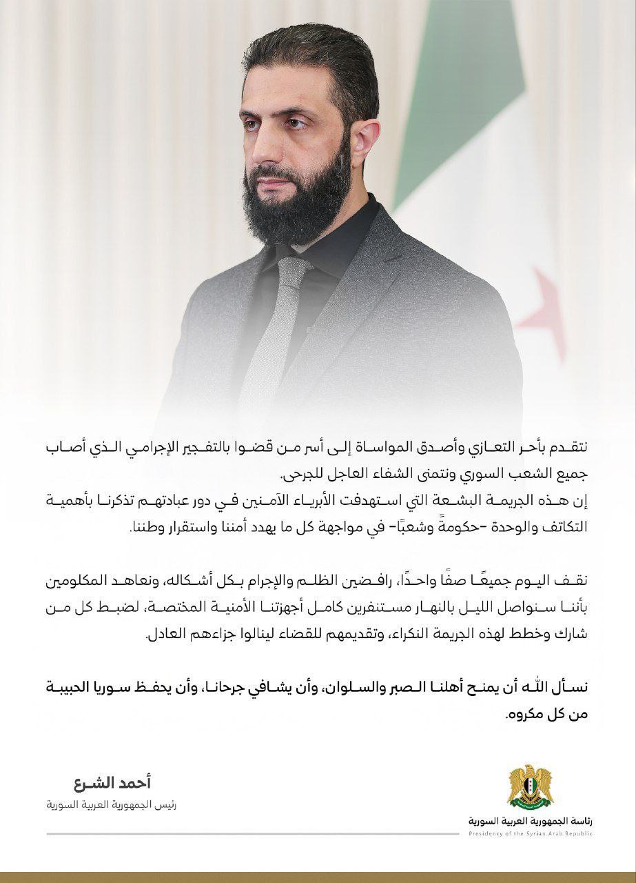 الرئيس الشرع يعزّي أُسر من قضوا بتفجير كنيسة مار إلياس بحي الدويلعة في دمشق آخر تحديث حزيران 23, 2025 شارك الفداء_ الرئيس الشرع يعزّي أُسر من قضوا بتفجير كنيسة مار إلياس بحي الدويلعة في دمشق. شارك FacebookWhatsAppFacebook MessengerTelegramTwitter