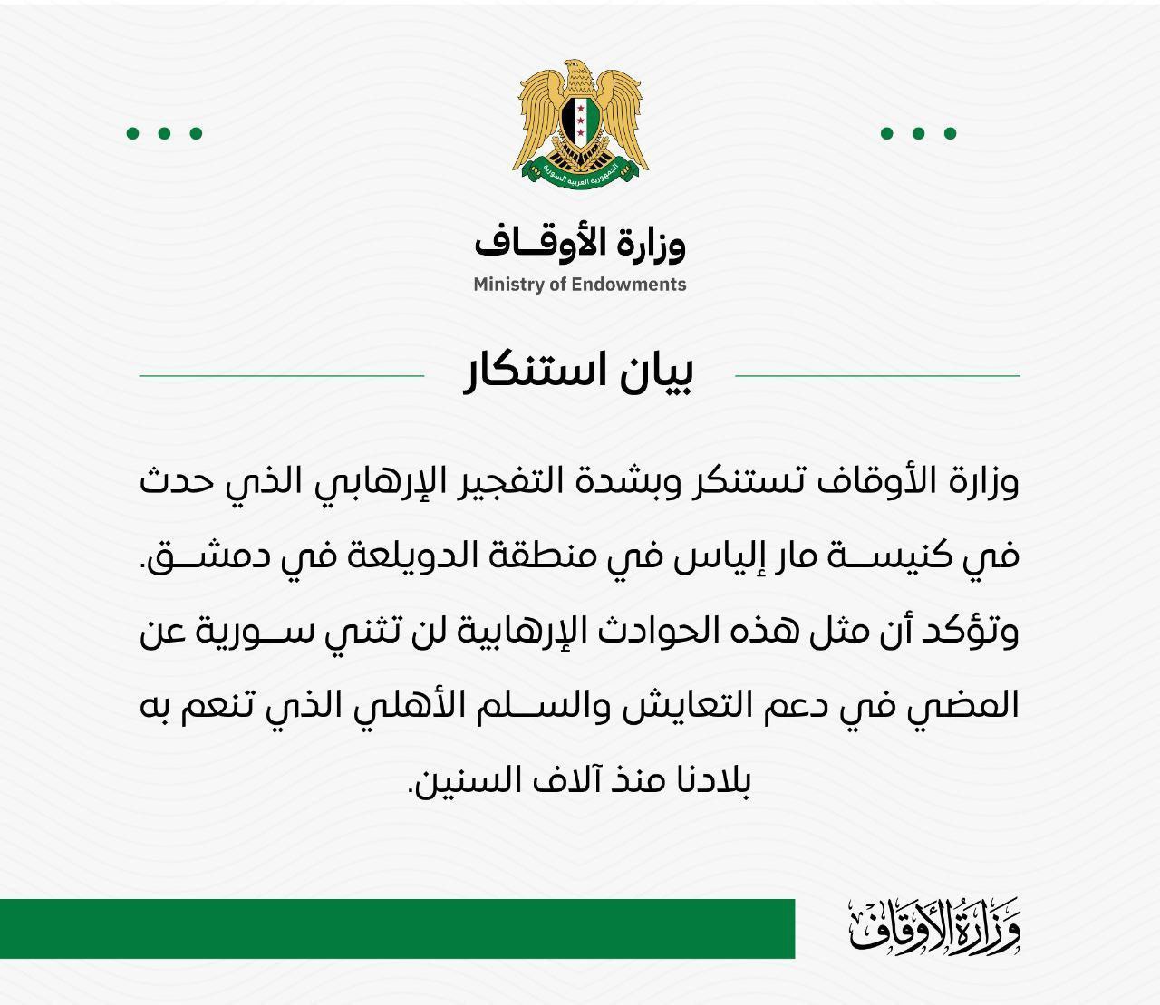 وزارة الأوقاف تستنكر وبشدة التفجير الإرهابي الذي حدث في كنيسة مار إلياس في منطقة الدويلعة في دمشق.