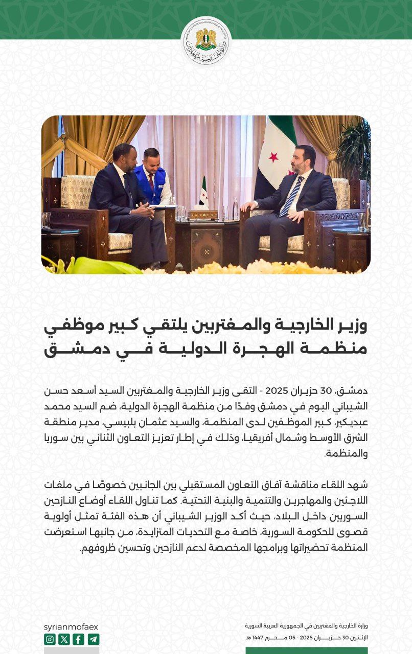 وزير الخارجية والمغتربين يلتقي كبير موظفي منظمة الهجرة الدولية في دمشق في حزيران 30, 2025 شارك الفداء_ وزير الخارجية والمغتربين يلتقي كبير موظفي منظمة الهجرة الدولية في دمشق. شارك FacebookWhatsAppFacebook MessengerTelegramTwitter