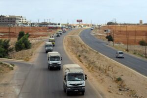 قافلة المساعدات مكوّنة من 47 شاحنة تحمل مواد غذائية وإغاثية في طريقها إلى مدينة السويداء.