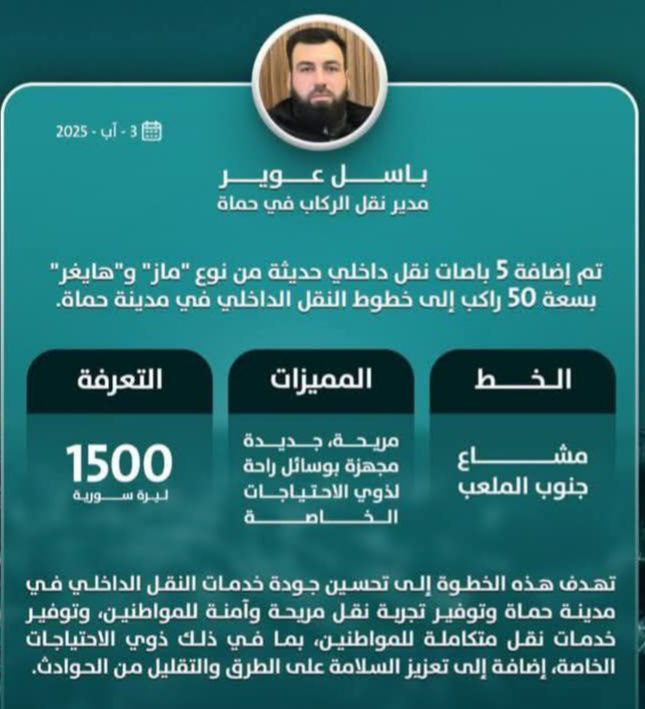 أفاد المهندس باسل العوير مدير مديرية نقل الركاب بحماة أنه تم إضافة 5 باصات نقل داخلي حديثة من نوع ماز وهايغر بسعة 50 راكباً إلى خطوط النقل الداخلي في مدينة حماة.
