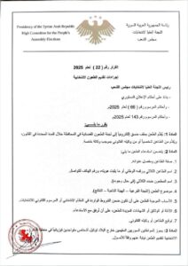 اللجنة العليا لانتخابات مجلس الشعب تصدر القرار رقم /22/ المتضمن إجراءات تقديم الطعون الانتخابية. في آب 26, 2025 شارك شارك FacebookWhatsAppFacebook MessengerTelegramTwitter