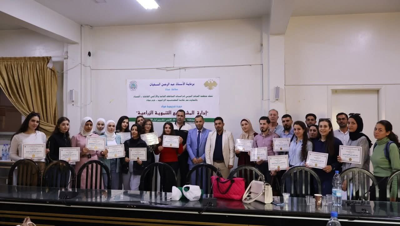 وعلى هامش حفل الاختتام، جرى تكريم المتدربين المشاركين الذين اجتازوا الدورة بنجاح، تقديراً لجهودهم ومشاركتهم الفاعلة في إنجاح أعمال الدورة، التي هدفت إلى رفع كفاءة الكوادر الزراعية وتعزيز قدراتهم في مجال إدارة وتنفيذ المشاريع التنموية الزراعية.