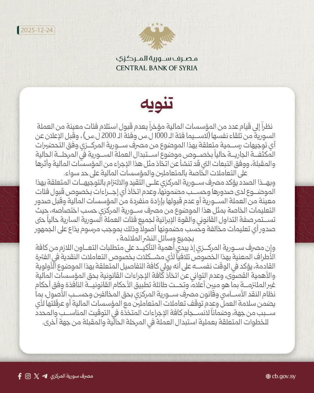 وأوضح المصرف في بيانه أن هذا الإجراء من قبل المؤسسات المالية جاء قبل الإعلان عن أيّ توجيهاتٍ رسمية بهذا الصدد، وبالتزامن مع التحضيرات المكثفة الجارية حالياً بخصوص استبدال العملة السورية في المرحلة الحالية والمقبلة.