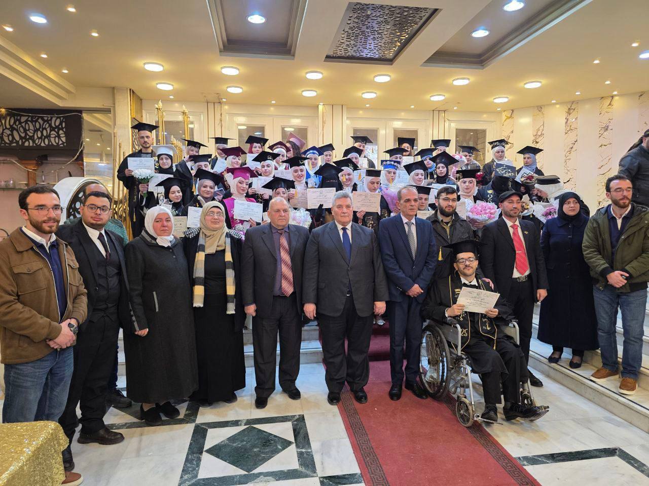 احتفلت جامعة حماة، اليوم الاثنين 12 كانون الثاني، بتخريج طلبة كلية الآداب والعلوم الإنسانية للعام الدراسي 2024–2025، في حفلٍ رسميٍّ وأكاديمي، بلغ عدد الخريجين المحتفى بهم خلاله 49 طالباً وطالبة، فيما تجاوز العدد الإجمالي لخريجي دفعة 2024–2025 في الجامعة 120 طالباً وطالبة.