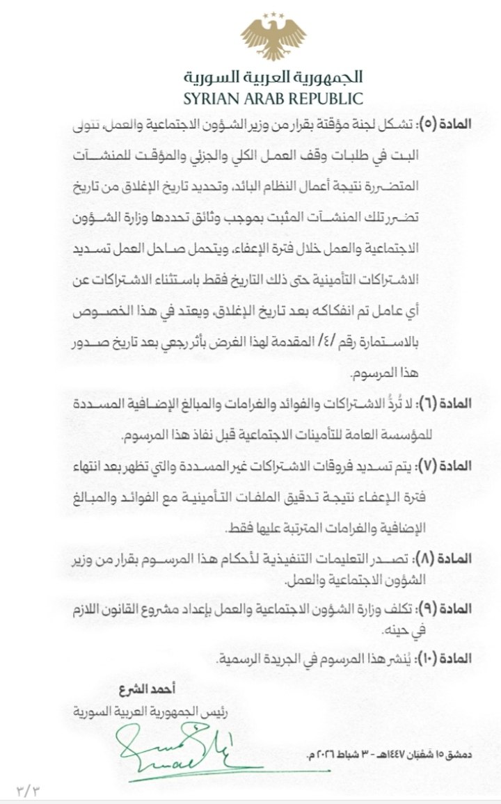 أصدر السيد الرئيس أحمد الشرع المرسوم رقم 29 لعام 2026، والذي يمثل خطوة استراتيجية لدعم الاستقرار الاقتصادي وتخفيف الأعباء المالية المتراكمة على قطاع الأعمال.