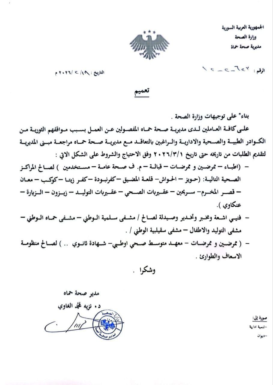 أعلنت مديرية صحة حماة، عن دعوتها جميع العاملين الذين فُصلوا من وظائفهم في القطاع الصحي نتيجة مواقفهم الثورية من النظام البائد، إلى مراجعة مبنى المديرية بهدف تقديم طلبات التعاقد، وإعادة الاستفادة من خبراتهم ضمن المؤسسات الصحية التابعة لها.