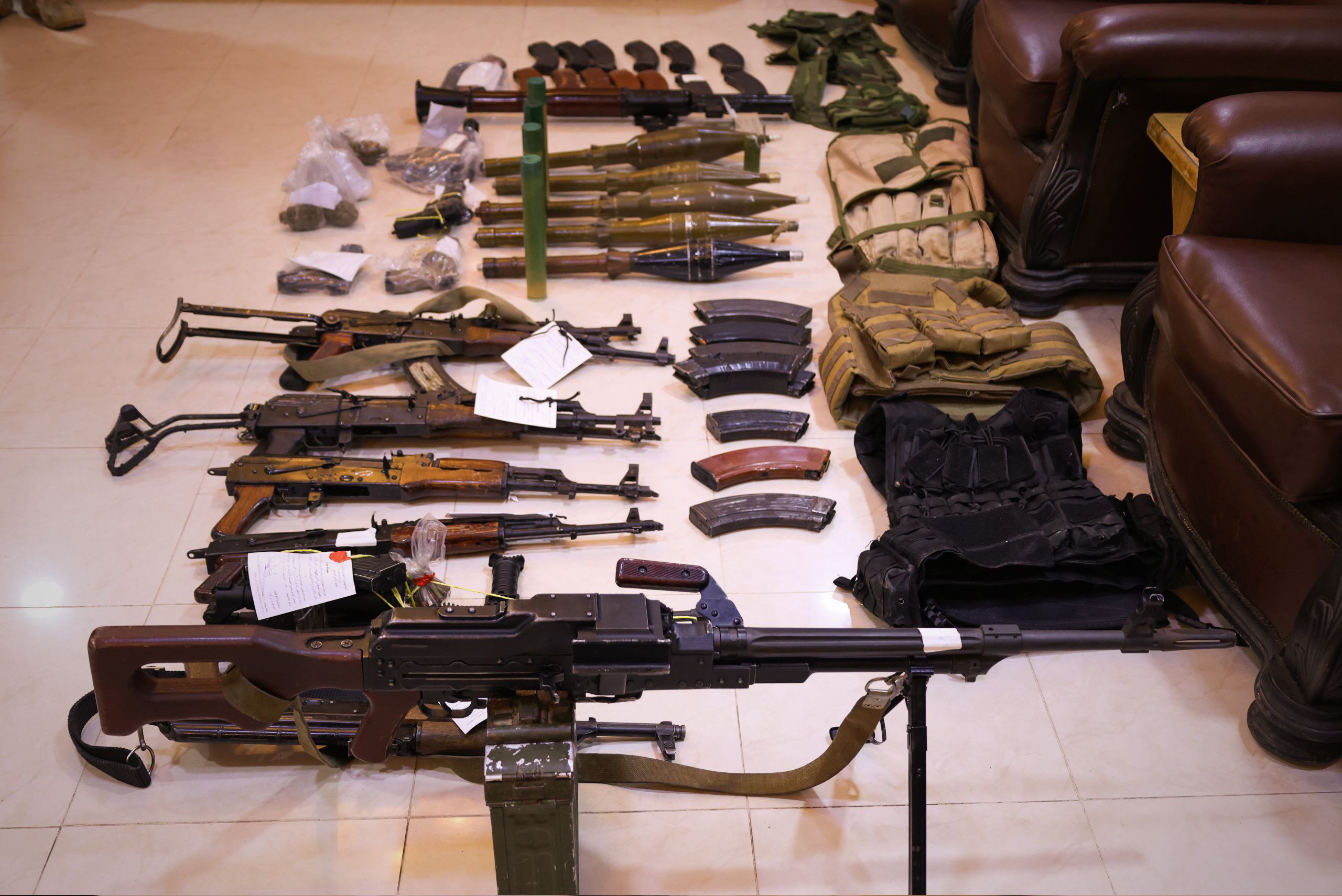 كما ضُبط بحوزتهم أسلحة وذخائر متنوعة، شملت أسلحة فردية من أنواع مختلفة، وقاذف آر بي جي مع حشواته، ورشاشاً آلياً، إضافة إلى تجهيزات عسكرية تضمنت جعبتين عسكريتين ومنظاراً ليلياً.