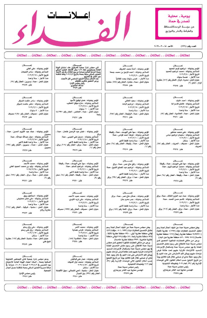 يعلن مجلس مدينة حماة عن انتهاء أعمال لجنة رسم مقابل التحسين للعقارات ذوات (2597 ـ 501 ـ مؤقت/4476 نهائي منطقة عقارية أولى ـ 5340 منطقة عقارية ثالثة ـ 5964 منطقة عقارية رابعة ـ 451 مؤقت/3035 نهائي منطقة عقارية ضاهرية ـ 3352 منطقة عقارية خامسة).