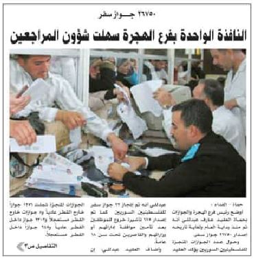 وحول عدد الجوازات المنجزة للفلسطينيين السوريين يؤكد العقيد عبدللي أنه تم إنجاز 22 جواز سفر للفلسطينيين السوريين كما تم إصدار 675 تأشيرة خروج للموظفين بعد تأمين موافقة إداراتهم أو وزاراتهم والقاصرين تحت سن 18 عاماً.