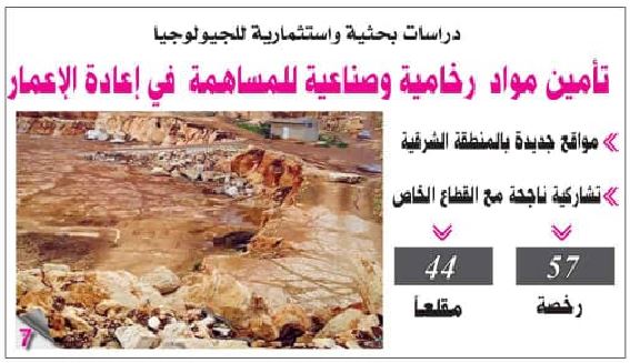 دراسات بحثية واستثمارية للجيولوجيا تأمين مواد رخامية وصناعية للمساهمة في إعادة الإعمار..57 رخصة و44 مقلعاً..مواقع جديدة بالمنطقة الشرقية..تشاركية ناجحة مع القطاع الخاص