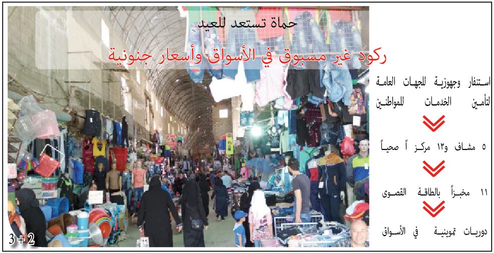حماة تستعد للعيد ركود غير مسبوق في الأسواق وأسعار جنونية .. استنفار وجهوزية للجهات العامة لتأمين الخدمات للمواطنين.. 5 مشاف و13 مركز اً صحياً..11 مخبزاً بالطاقة القصوى..دوريات تموينية في الأسواق
