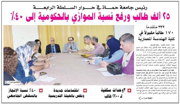 رئيس جامعة حماة في حوار السلطة الرابعة … 25 ألف طالب ورفع نسبة الموازي بالحكومية إلى 40% ..3وحدات سكنية لـ 2200 طالب..اختصاصات جديدة ونقص بالهيئة التدريسية..40% نسبة الإنجاز بالمشفى الجامعي ..11 مركزاً للتسجيل بالمفاضلة..تأمين وسائط نقل للموظفين..