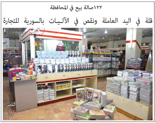 كشفت مديرة السورية للتجارة صباح السرميني عن وجود 122 مركز بيع في المحافظة منها 4 مراكز قيد الاستثمار، ففي مدينة حماة وريفها الخارجي يوجد 52 مركزاً وفي سلمية 13 مركزاً وفي السقيلبية 14 مركزاً وفي محردة 5 مراكز وفي مصياف 36 مركزاً وجميع هذه المراكز تؤمن جميع المستلزمات للمواطنين من قرطاسية ومواد غذائية وغيرها، كما يوجد أقسام جديدة للقرطاسية والغذائية والمنظفات ، وتم مؤخراً افتتاح قسم جديد للخضار ، وهناك خطة للتوسع في افتتاح منافذ بيع جديدة بحيث تصل المواد والسلع الغذائية إلى كل قرية وحي.
