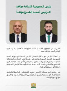 حيث هنّأ الرئيس عون خلال الاتصال الرئيس أحمد الشرع لتوليه رئاسة الجمهورية العربية السورية، وأكد على ضرورة تعزيز التعاون والعلاقات الدبلوماسية بين البلدين الشقيقين، بما يحقق الأمن والسلام للشعبين السوري واللبناني.