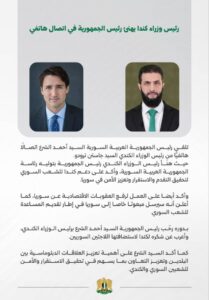 تلقى رئيس الجمهورية العربية السورية السيد أحمد الشرع اتصالاً هاتفياً من رئيس الوزراء الكندي السيد جاستن ترودو. حيث هنأ رئيس الوزراء الكندي رئيس الجمهورية بتوليه رئاسة الجمهورية العربية السورية، وأكد على دعم كندا للشعب السوري لتحقيق التقدم والاستقرار وتعزيز الأمن في سوريا.