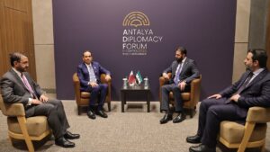 لقاء جمع رئيس الجمهورية العربية السورية السيد أحمد الشرع ومعالي وزير الخارجية السيد أسعد الشيباني مع رئيس مجلس الوزراء وزير الخارجية القطري معالي الشيخ محمد بن عبد الرحمن آل ثاني على هامش منتدى أنطاليا الدبلوماسي.