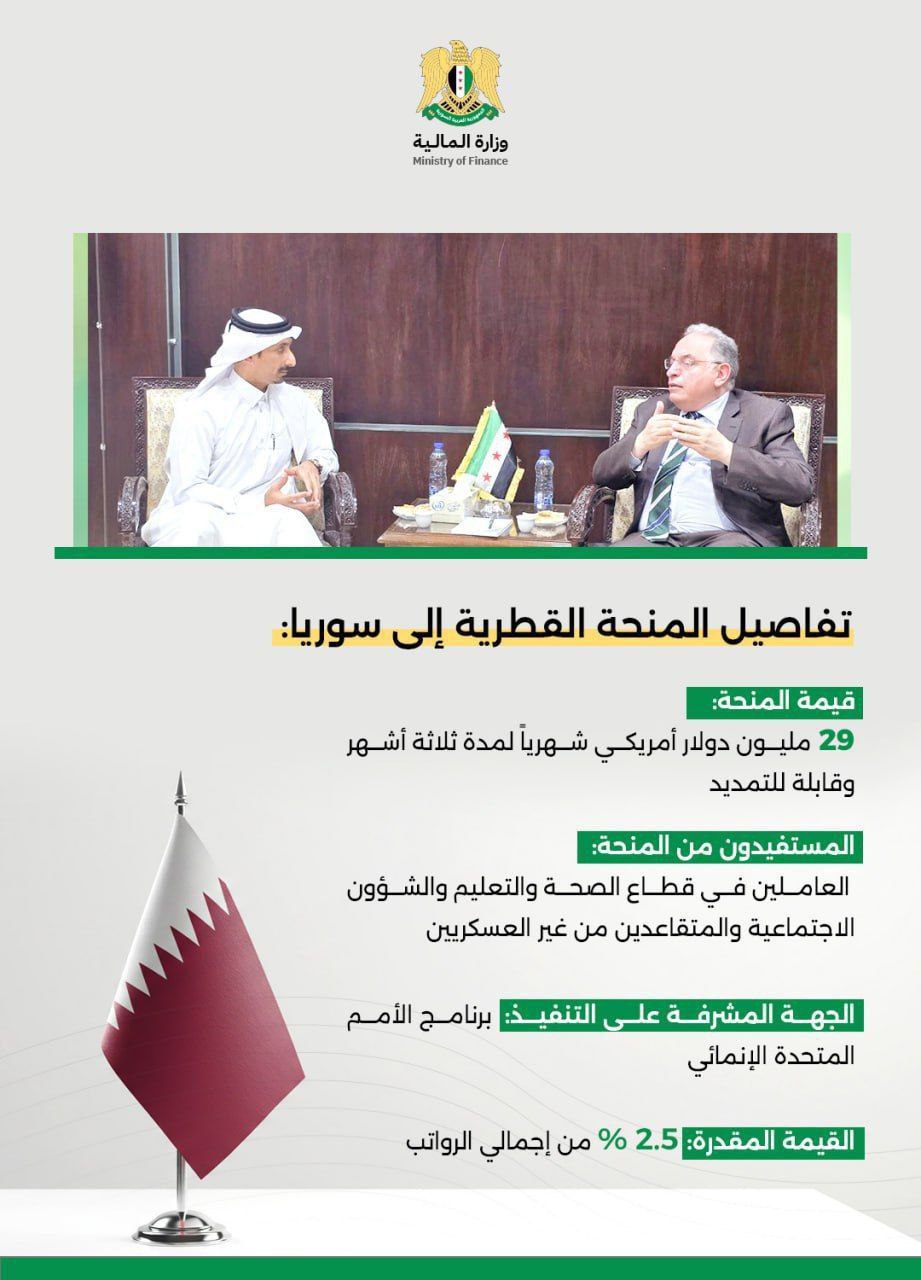 الفداء_ وزير المالية الدكتور “محمد يُسر برنية” يُعلن عن منحة قطرية قدرها 29 مليون دولار شهرياً لتغطية رواتب القطاعات الصحية والتعليمية والشؤون الاجتماعية.