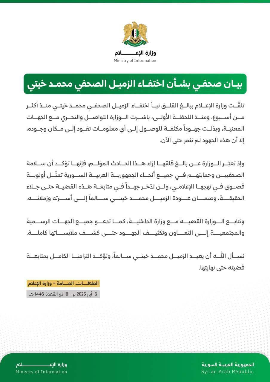 بيان صحفي صادر عن وزارة الإعلام بشأن اختفاء الزميل الصحفي محمد خيتي في أيار 16, 2025 شارك الفداء_ بيان صحفي صادر عن وزارة الإعلام بشأن اختفاء الزميل الصحفي محمد خيتي شارك FacebookWhatsAppFacebook MessengerTelegramTwitter