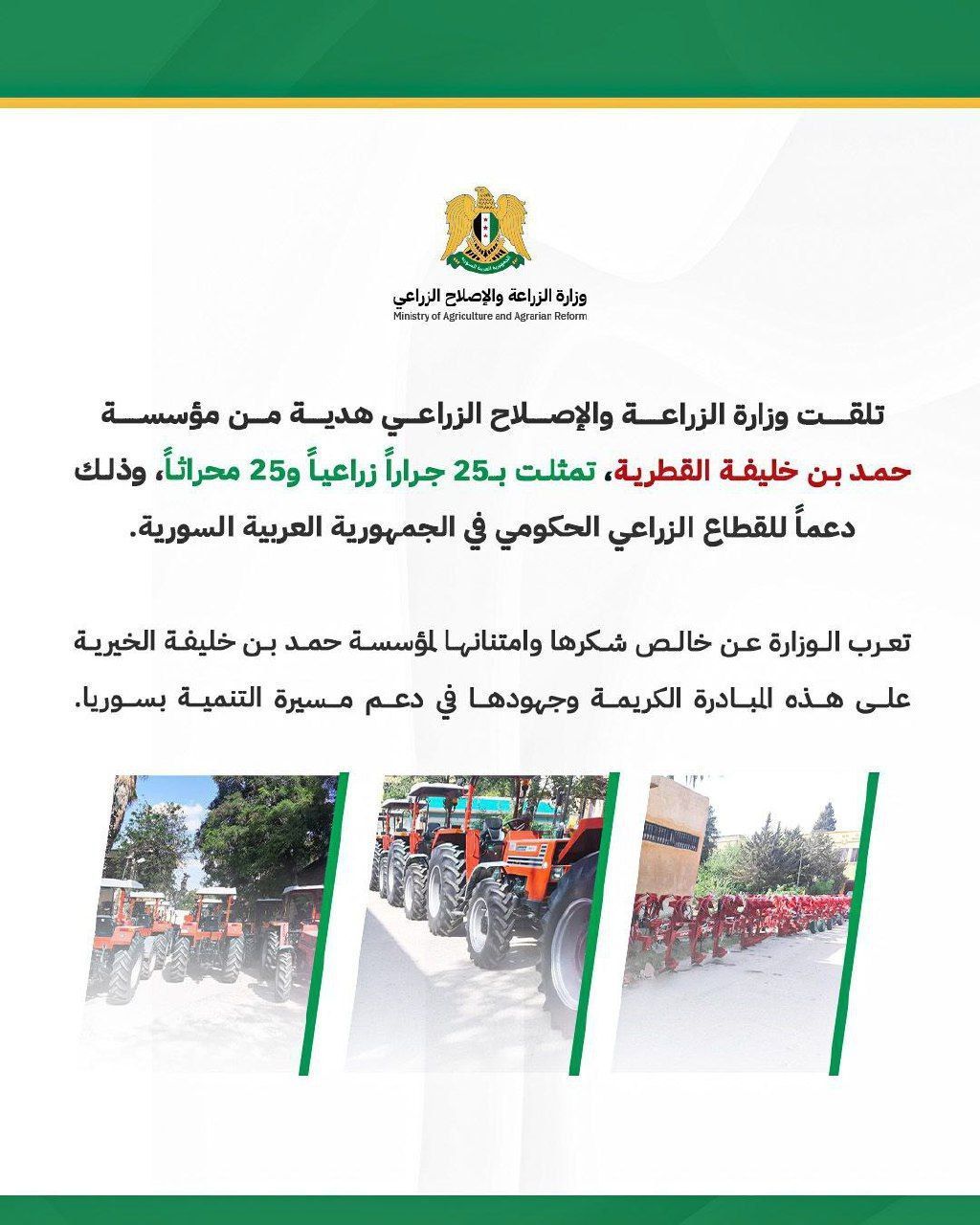 مؤسسة حمد بن خليفة القطرية تهدي وزارة الزراعة، والإصلاح الزراعي معدات زراعية في أيار 18, 2025 شارك الفداء_ مؤسسة حمد بن خليفة القطرية تهدي وزارة الزراعة، والإصلاح الزراعي معدات زراعية. شارك FacebookWhatsAppFacebook MessengerTelegramTwitter