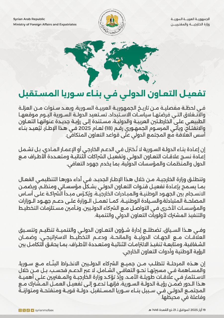 وزارة الخارجية والمغتربين توضح رؤيتها حول تفعيل التعاون الدولي في بناء سوريا المستقبل في أيار 19, 2025 شارك الفداء_ وزارة الخارجية والمغتربين توضح رؤيتها حول تفعيل التعاون الدولي في بناء سوريا المستقبل. شارك FacebookWhatsAppFacebook MessengerTelegramTwitter