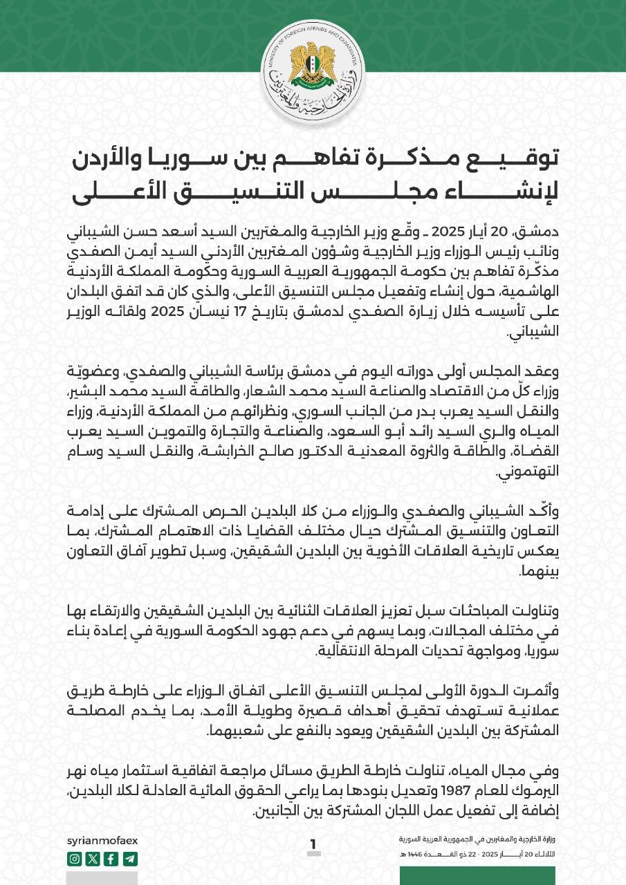 سوريا والأردن توقعان مذكرة تفاهم لإنشاء مجلس التنسيق الأعلى في أيار 20, 2025 شارك الفداء_ سوريا والأردن توقعان مذكرة تفاهم لإنشاء مجلس التنسيق الأعلى. شارك FacebookWhatsAppFacebook MessengerTelegramTwitter
