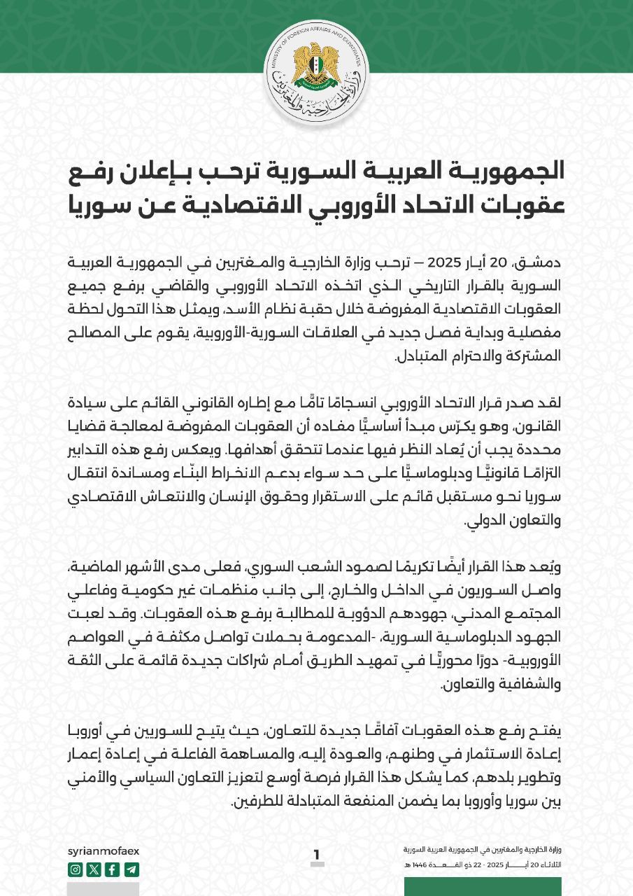 الجمهورية العربية السورية ترحب بإعلان رفع عقوبات الاتحاد الأوروبي الاقتصادية في أيار 20, 2025 شارك الفداء_ الجمهورية العربية السورية ترحب بإعلان رفع عقوبات الاتحاد الأوروبي الاقتصادية. شارك FacebookWhatsAppFacebook MessengerTelegramTwitter
