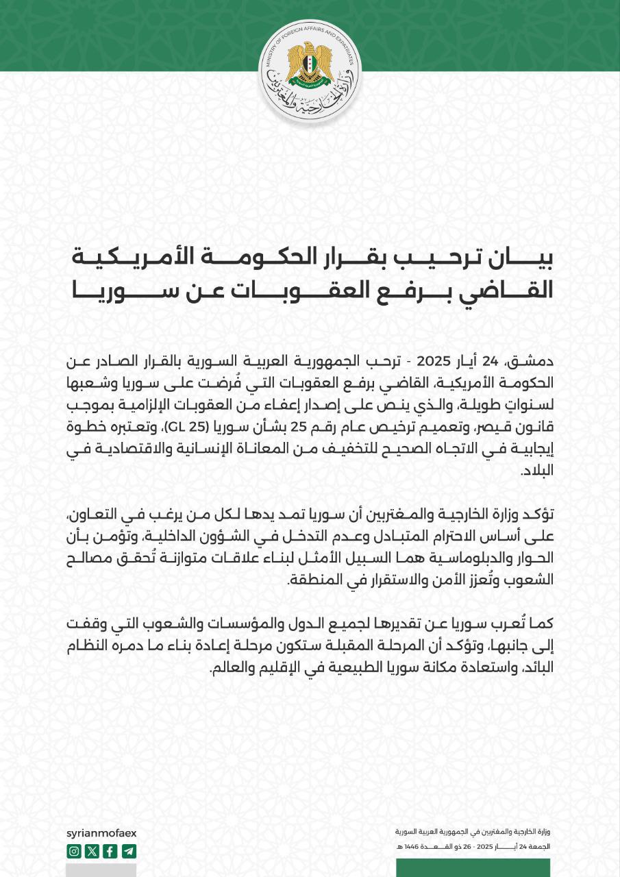 وزارة الخارجية: بيان ترحيب بقرار الحكومة الأمريكية القاضي برفع العقوبات عن سوريا. في أيار 24, 2025 شارك الفداء_ وزارة الخارجية: بيان ترحيب بقرار الحكومة الأمريكية القاضي برفع العقوبات عن سوريا. شارك FacebookWhatsAppFacebook MessengerTelegramTwitter