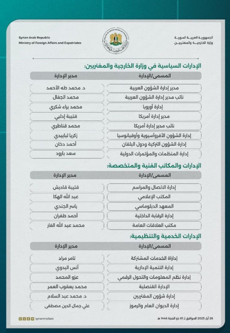 وزارة الخارجية والمغتربين تعلن في بيان عن تكليفات جديدة شملت عدداً من الإدارات والمكاتب التابعة لها في أيار 28, 2025 شارك الفداء_ وزارة الخارجية والمغتربين تعلن في بيان عن تكليفات جديدة شملت عدداً من الإدارات والمكاتب التابعة لها. شارك FacebookWhatsAppFacebook MessengerTelegramTwitter
