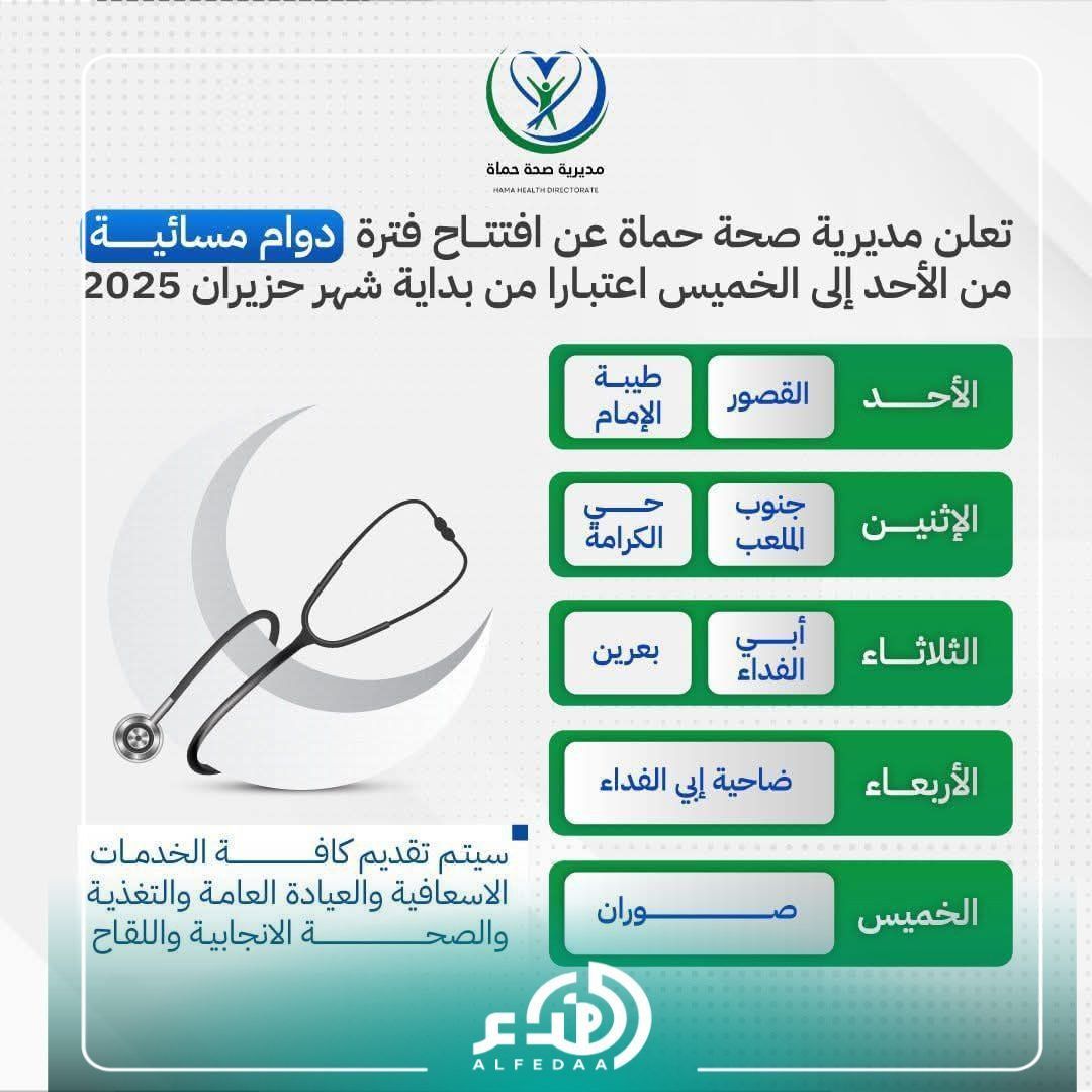 تعلن مديرية صحة حماة عن افتتاح فترة دوام مسائي من الأحد إلى الخميس، اعتباراً من بداية شهر حزيران 2025،وذلك ضمن جهودها المستمرة لتقديم أفضل الخدمات الصحية للمواطنين.