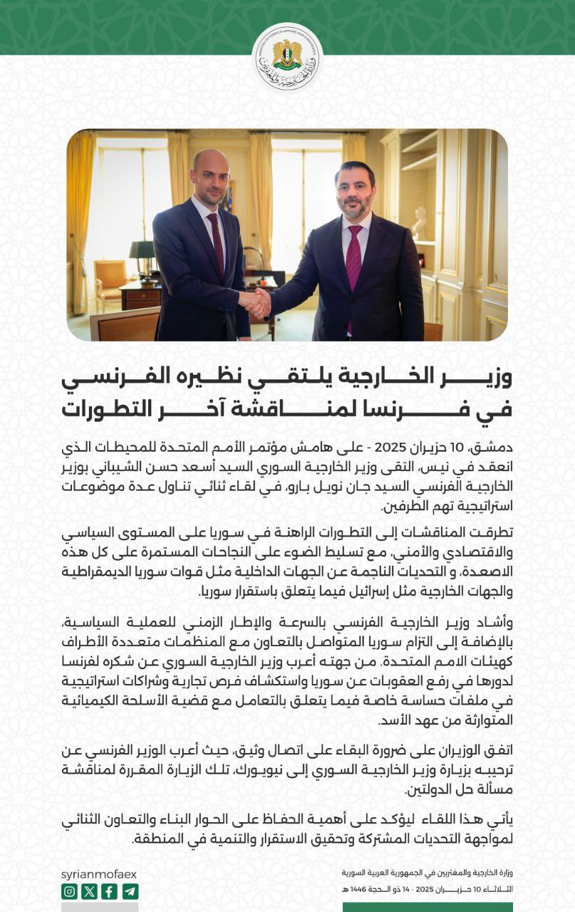 وزارة الخارجية والمغتربين: وزير الخارجية يلتقي نظيره الفرنسي في فرنسا لمناقشة آخر التطورات. في حزيران 10, 2025 شارك وزارة الخارجية والمغتربين: وزير الخارجية يلتقي نظيره الفرنسي في فرنسا لمناقشة آخر التطورات. شارك FacebookWhatsAppFacebook MessengerTelegramTwitter