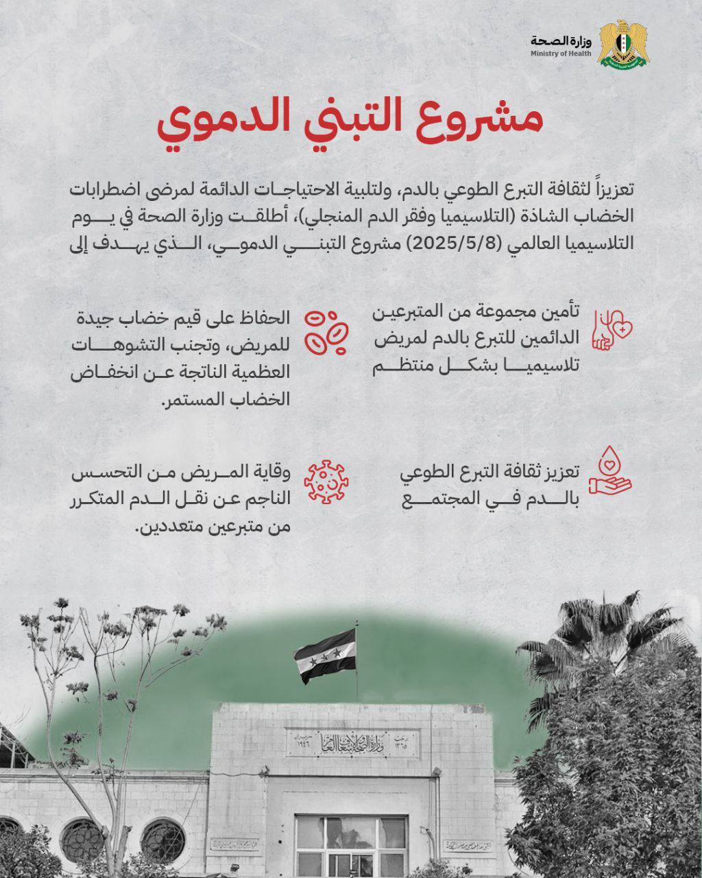 تعزيزاً لثقافة التبرع الطوعي بالدم، ولتلبية الاحتياجات الدائمة لمرضى اضطرابات الخضاب الشاذة، أطلقت وزارة الصحة مشروع التبني الدموي