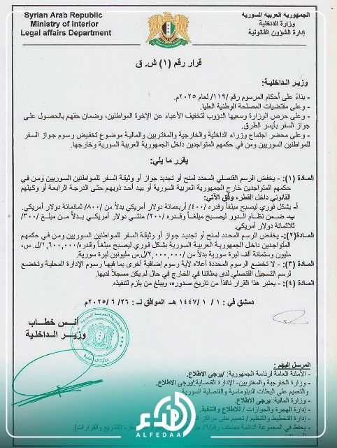 وزير الداخلية أنس خطاب يصادق على قرار يقضي بتخفيض الرسوم المستوفاة لقاء منح جوازات السفر في إطار التسهيلات المقدّمة للمواطنين وحرصاً من الوزارة على تخفيف الأعباء عنهم