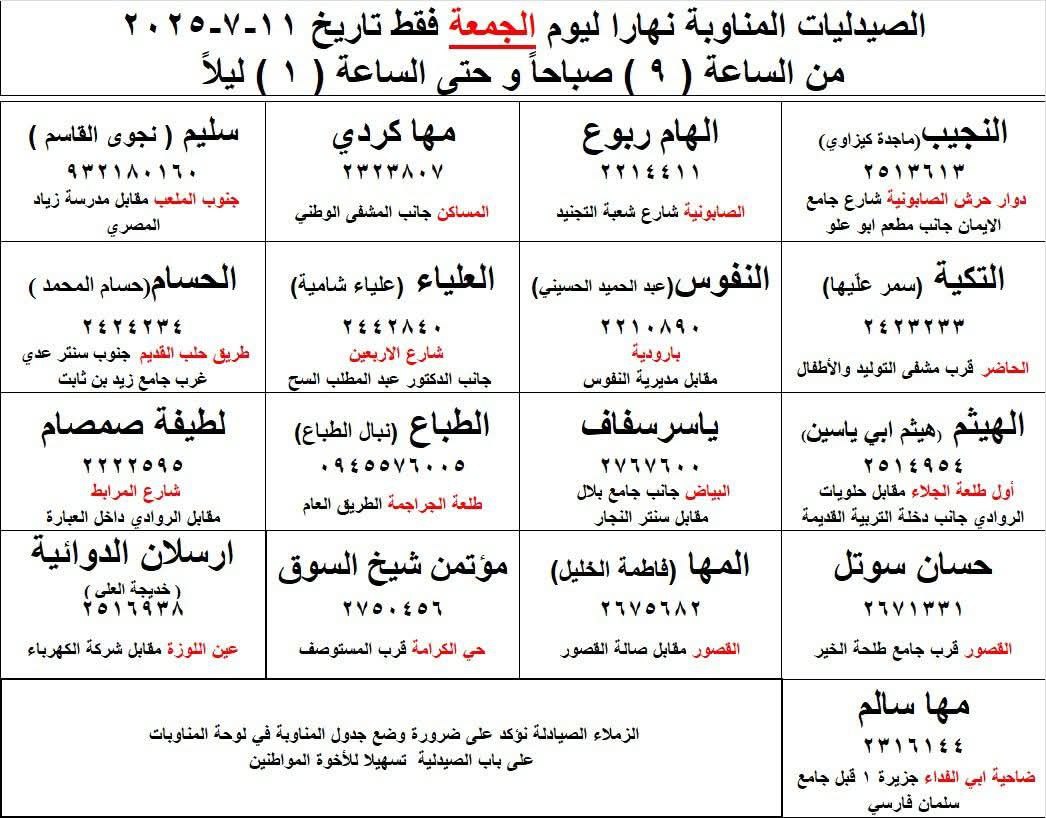 الصيدليات المناوبة نهارا في مدينة حماة آخر تحديث تموز 11, 2025 شارك الفداء _ الصيدليات المناوبة نهاراً في مدينة حماة ليوم الجمعة فقط 11/ 7 / 2025 من الساعة ( 9 ) صباحاً وحتى الساعة( 1 ) ليلاً مع دوام الصحة والسلامة للجميع. شارك FacebookWhatsAppFacebook MessengerTelegramTwitter