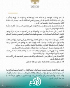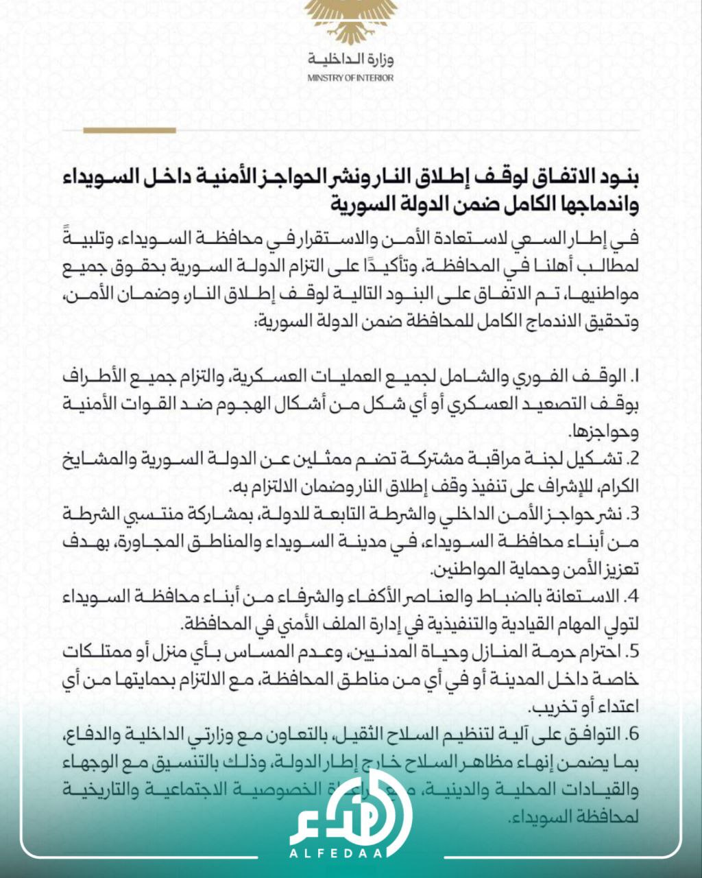 وزارة الداخلية تعلن بنود اتفاق وقف إطلاق النار ونشر الحواجز الأمنية داخل السويداء واندماجها الكامل ضمن الدولة السورية في تموز 16, 2025 شارك الفداء_ وزارة الداخلية تعلن بنود اتفاق وقف إطلاق النار ونشر الحواجز الأمنية داخل السويداء واندماجها الكامل ضمن الدولة السورية. شارك FacebookWhatsAppFacebook MessengerTelegramTwitter