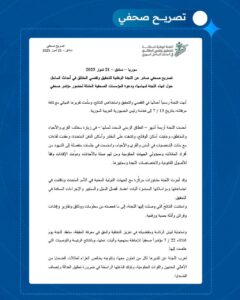 اللجنة الوطنية للتحقيق وتقصي الحقائق في أحداث الساحل تعقد غداً مؤتمراً صحفياً للإحاطة بمنهجية وآليات ونتائج عملها آخر تحديث تموز 23, 2025 شارك شارك FacebookWhatsAppFacebook MessengerTelegramTwitter