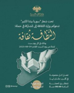 أطلقت وزارة الثقافة حملة مجتمعية للنظافة تحت شعار “سوريا بيتنا الكبير”، وذلك بهدف تعزيز ثقافة النظافة لدى المواطنين والمساهمة في جعل المدن السورية أكثر جمالاً، وانطلاقاً من أن النظافة من الإيمان .