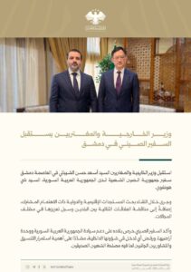 وزير الخارجية والمغتربين السيد أسعد حسن الشيباني يستقبل السفير الصيني بدمشق السيد شي هونغوي. في آب 10, 2025 شارك شارك FacebookWhatsAppFacebook MessengerTelegramTwitter