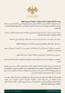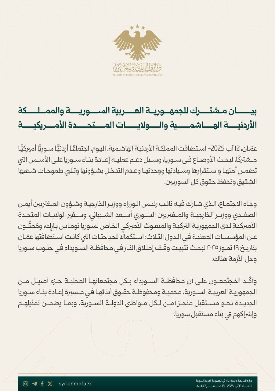 بيان مشترك للجمهورية العربية السورية والمملكة الأردنية الهاشمية والولايات المتحدة الأمريكية في آب 12, 2025 شارك الفداء_ بيان مشترك للجمهورية العربية السورية والمملكة الأردنية الهاشمية والولايات المتحدة الأمريكية. شارك FacebookWhatsAppFacebook MessengerTelegramTwitter