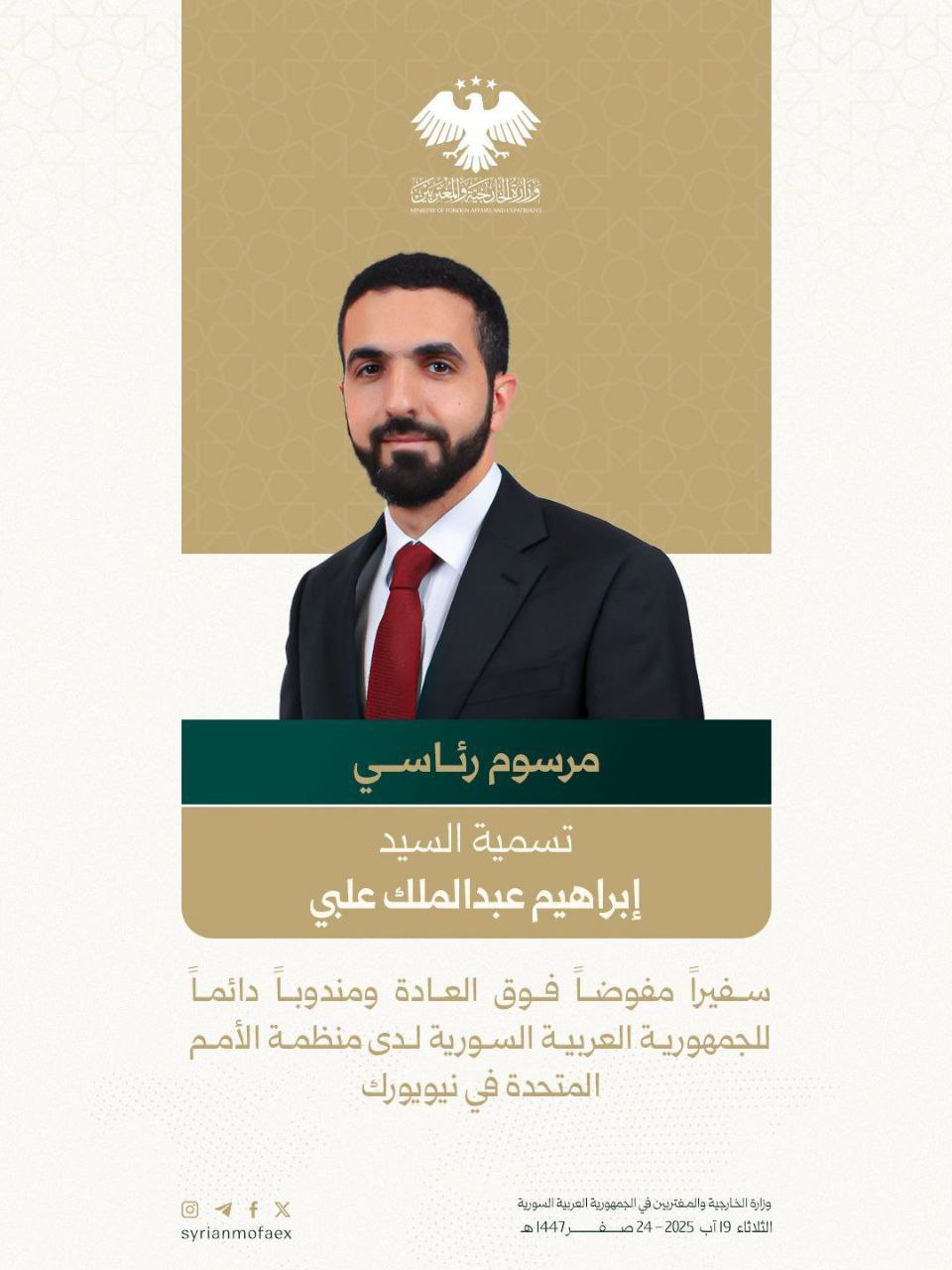أصدر السيد الرئيس احمد الشرع اليوم المرسوم رقم (142) لعام 2025 القاضي بتعيين السيد إبراهيم عبد الملك علبي سفيراً مفوضاً فوق العادة، ويعتمد مندوباً دائماً للجمهورية العربية السورية لدى منظمة الأمم المتحدة في نيويورك.
