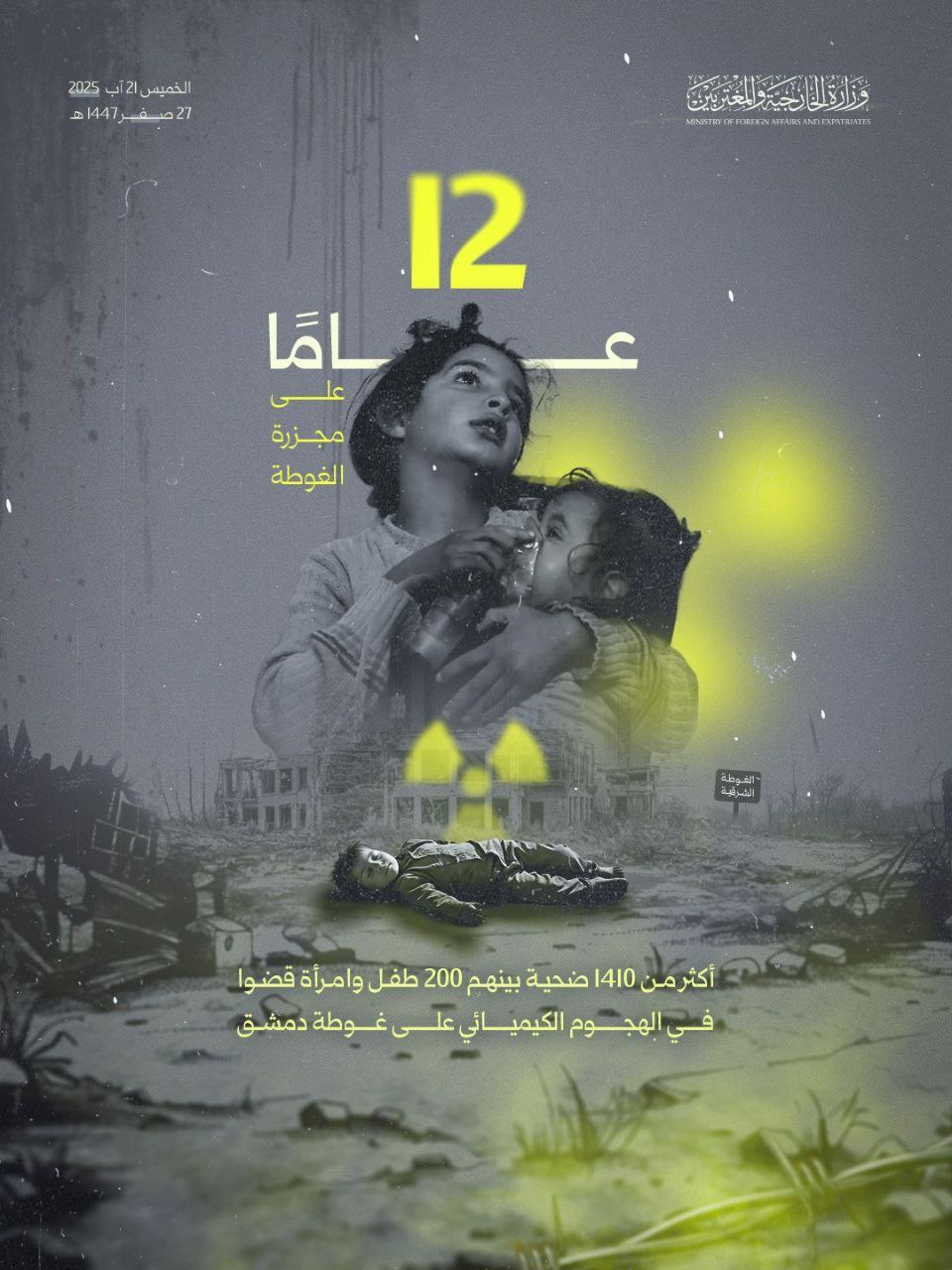 12 عاماًً على مجزرة الغوطة في آب 21, 2025 شارك الفداء_ أكثر من 1410 ضحية بينهم 200 طفل، وامرأة قضوا في الهجوم الكيماوي على غوطة دمشق. الهجمات الكيماوية جريمة حرب لن تُمحى من الذاكرة، وستبقى أولوية حتى تحقيق العدالة، ومحاسبة المجرمين. شارك FacebookWhatsAppFacebook MessengerTelegramTwitter