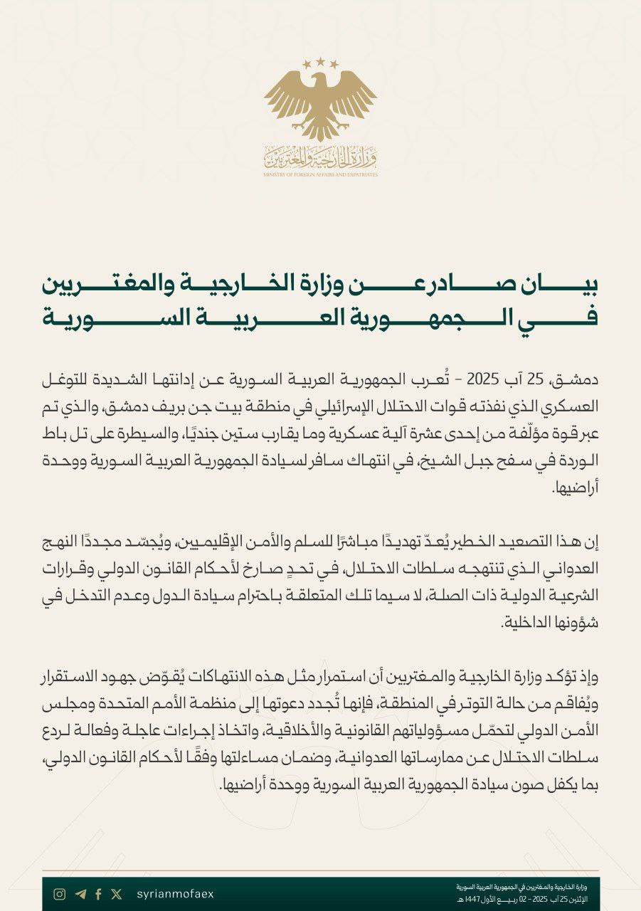 بيان صادر عن وزارة الخارجية والمغتربين في الجمهورية العربية السورية آخر تحديث آب 25, 2025 شارك الفداء_ بيان صادر عن وزارة الخارجية والمغتربين في الجمهورية العربية السورية شارك FacebookWhatsAppFacebook MessengerTelegramTwitter