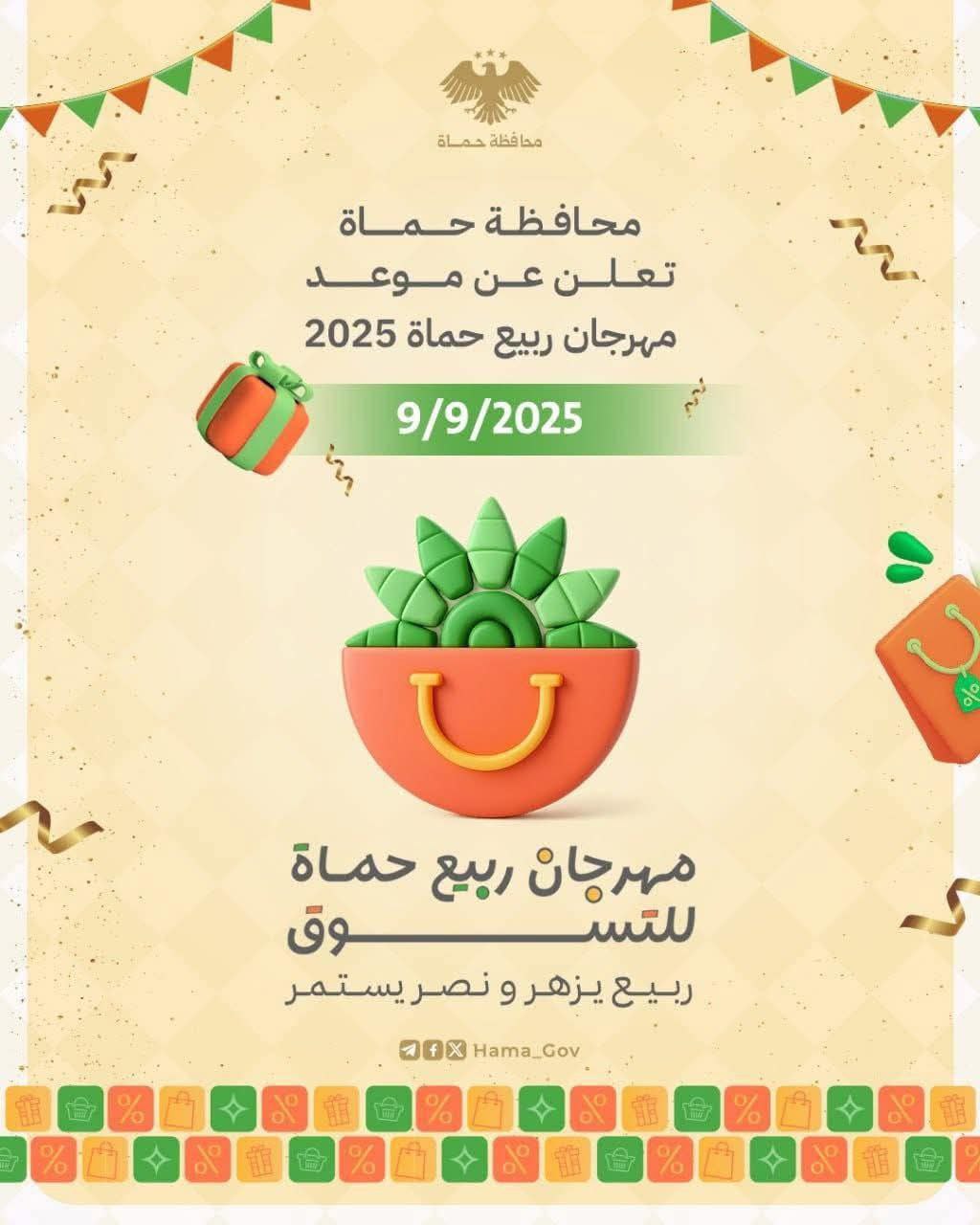تتواصل في حماة التحضيرات لاستقبال مهرجان التسوق ربيع حماة 2025 الذي ينطلق في التاسع من أيلول تحت شعار: ربيع يزدهر ونصر يستمر، حيث يحمل المهرجان صبغة التحرير، ويجسد روح الانتصار من خلال عروض مميزة ترفيهية وتفاعلية تنقل التراث الحموي الأصيل. ويجري حاليا تجهيز الأكشاك والمواد اللازمة لاستقبال الزوار على مدى عدة أيام.