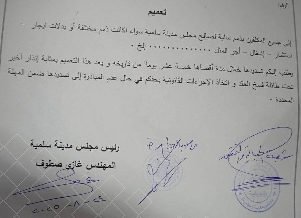 مجلس مدينة سلمية يوجه إنذاراً بضرورة دفع الذمم المالية في آب 26, 2025 شارك مراسل الفداء: مجلس مدينة سلمية يوجه إنذاراً بضرورة دفع الذمم المالية بأنواعها المختلفة لصالح المجلس خلال مدة أقصاها 15 يوماً، تحت طائلة المساءلة للمخالفين. شارك FacebookWhatsAppFacebook MessengerTelegramTwitter