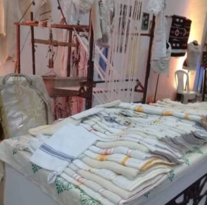 وأضاف إن أهم القطع التي يقدمها البرانص والمناشف، والشالات وغيرها من المشغولات اليدوية وأخرى بالتحرير الطبيعي .