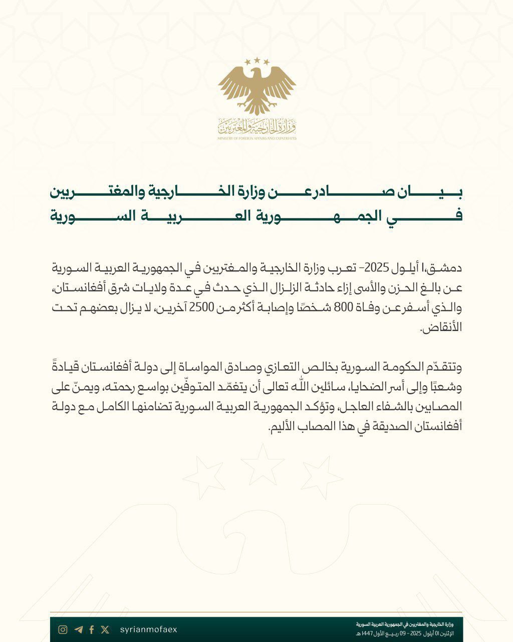 سوريا تعرب عن تضامنها مع أفغانستان جراء الزلزال الذي أودى بحياة المئات وتتوجه بالتعازي إليها قيادةً وشعباً في أيلول 1, 2025 شارك الفداء_ سوريا تعرب عن تضامنها مع أفغانستان جراء الزلزال الذي أودى بحياة المئات وتتوجه بالتعازي إليها قيادةً وشعباً. شارك FacebookWhatsAppFacebook MessengerTelegramTwitter